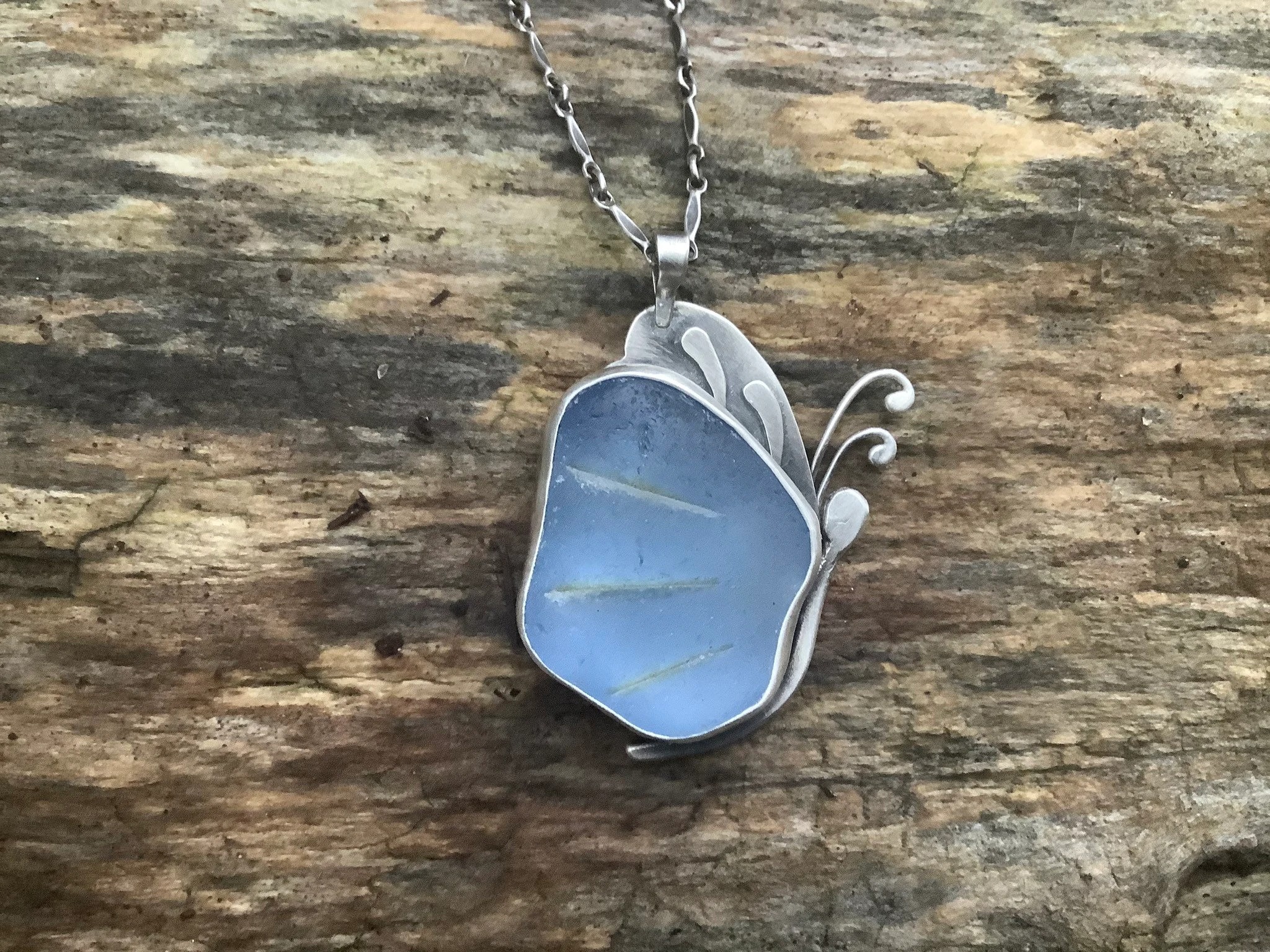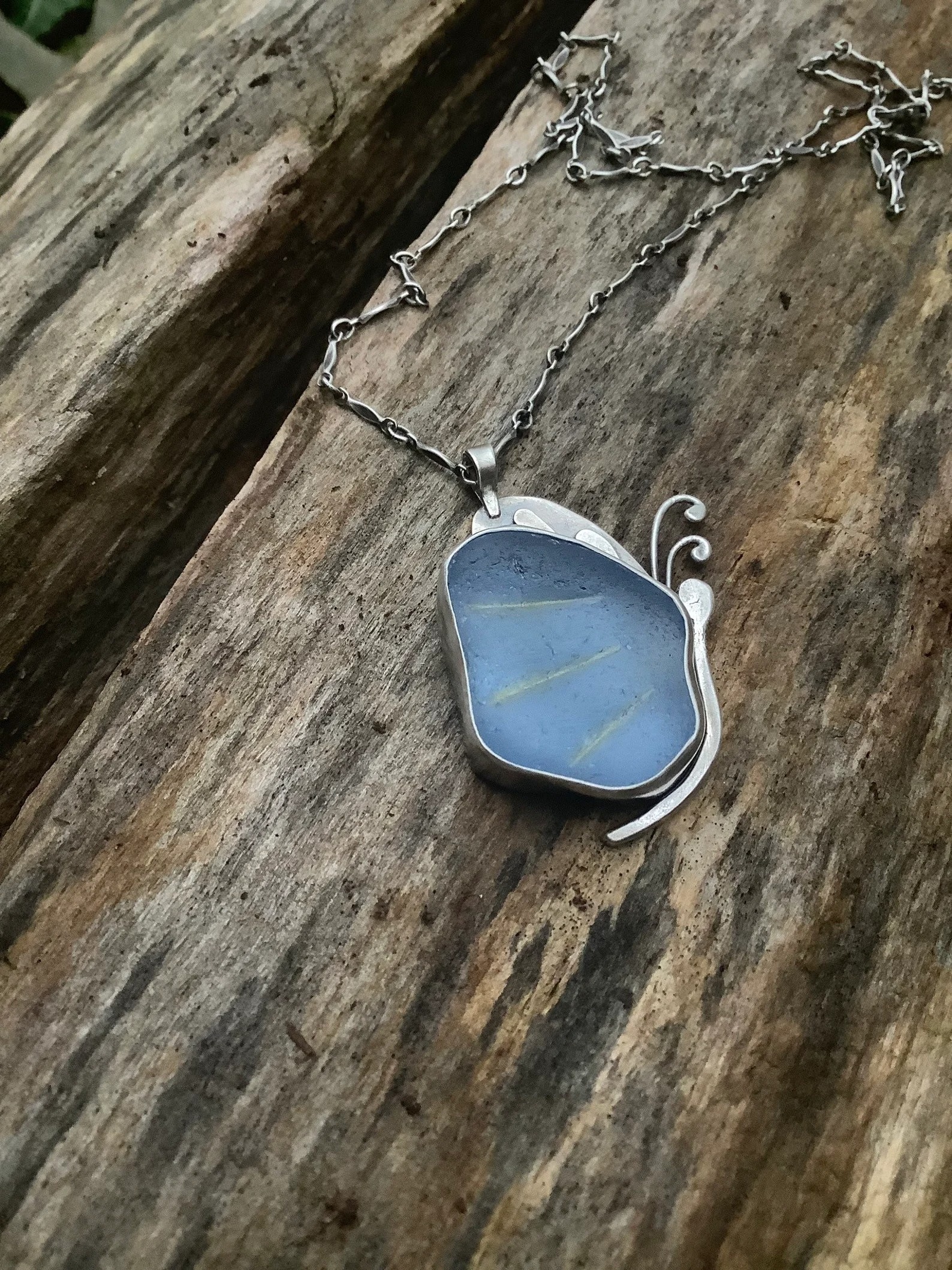 Blue sea glass butterfly pendant